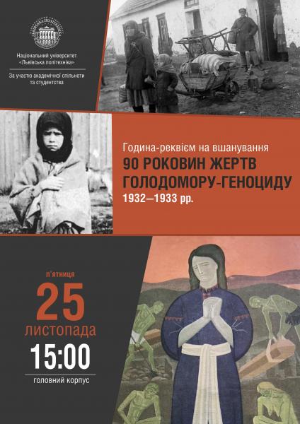Щороку в четверту суботу листопада Україна вшановує пам’ять жертв Голодомору 1932–1933 років і масових штучних голодів 1921–1923 і 1946–1947 років. Цьогоріч День пам’яті жертв голодоморів припадає на 26 листопада. Національний університет "Львівська політехніка" вшанує скорботну дату годиною-реквіємом 25 листопада.